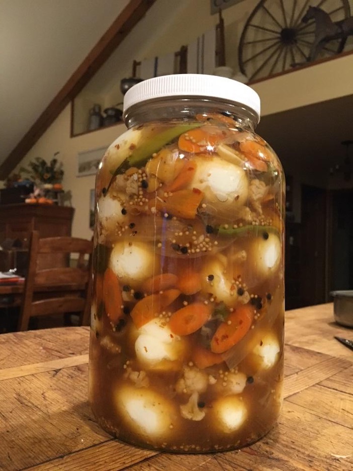 Combine all ingredients other than eggs in a large saucepan. Boil for 15 minutes. Put eggs in large glass jars or preferred pickling containers. Pour boiled mixture over eggs and lightly stir to distribute ingredients. If you didn’t fill the whole container, top it off with hot water. Refrigerate for 2 weeks. Enjoy