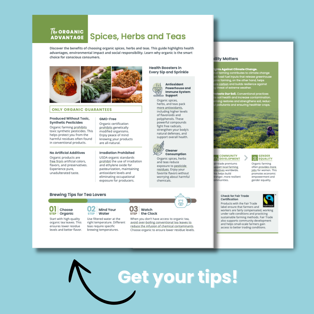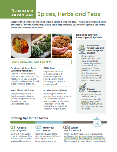 Descargue nuestra nueva hoja de consejos sobre especias, hierbas y tés orgánicos. Aprenda sobre los beneficios para la salud, el impacto medioambiental y la pureza de las opciones orgánicas - ¡todo en una guía rápida!