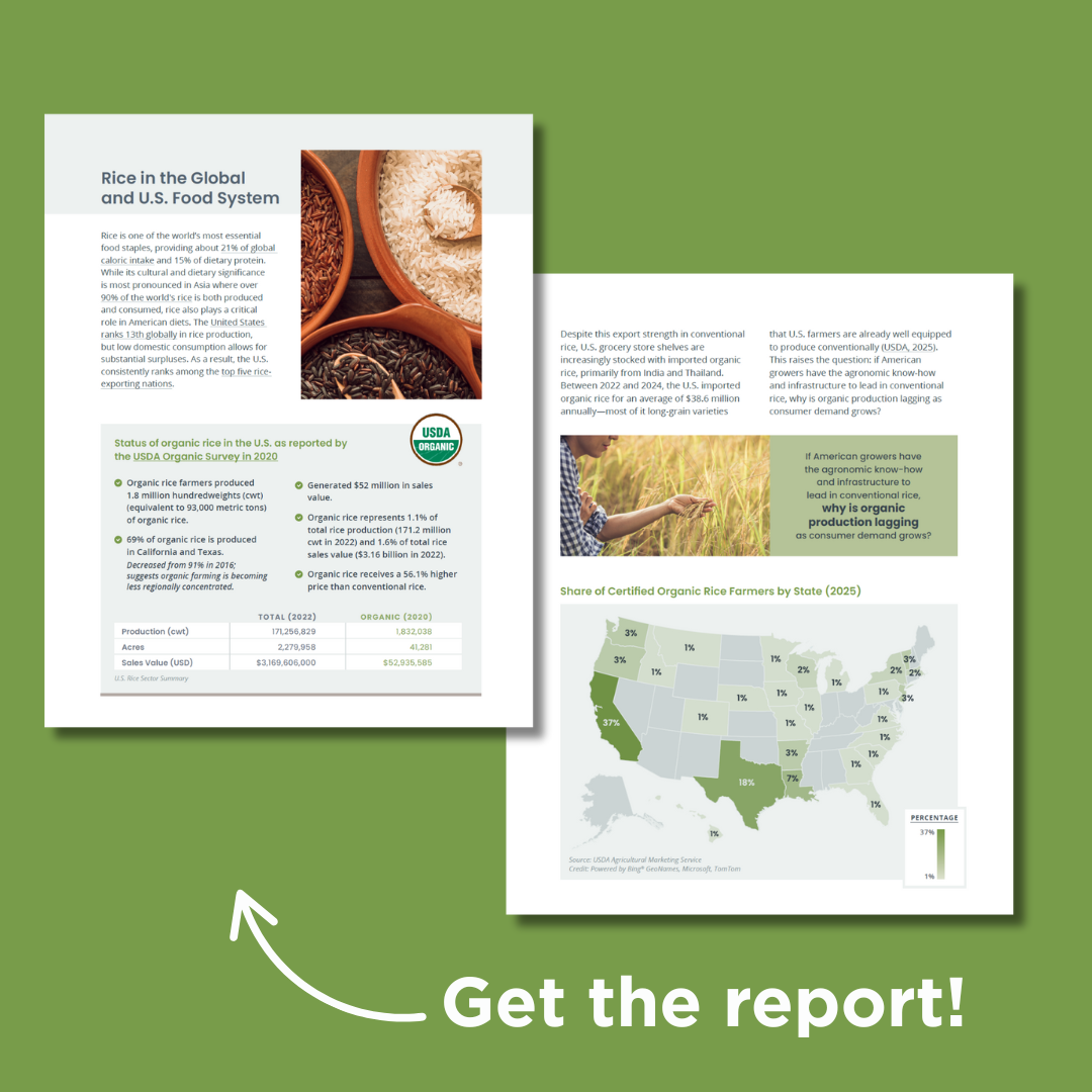 Discover key insights from a national study on U.S. organic rice, highlighting rising consumer demand, production challenges, and opportunities to grow the domestic market. Download the full report to explore how farmers, policymakers, and buyers can help close the supply gap.