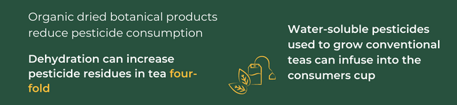 Reducing pesticide use during production and processing is especially important for dried botanical products like spices, herbs and teas, as the dehydration process can concentrate any existing residues on the fresh product.