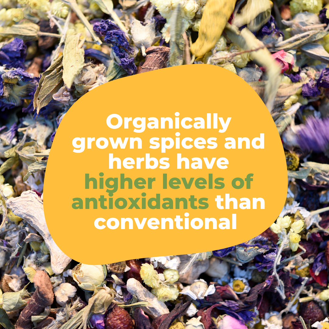 Spices, herbs and teas are known for healing properties like fighting off infections, building immune systems and adding flavor to your favorite foods. Add “organically grown” and the health benefits include higher nutritional quality and more antioxidants than non-organic.