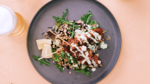 - Assemble the bowls with rice and barley, sauce, and chicken skewers. Finish with fresh squeezed lemon.