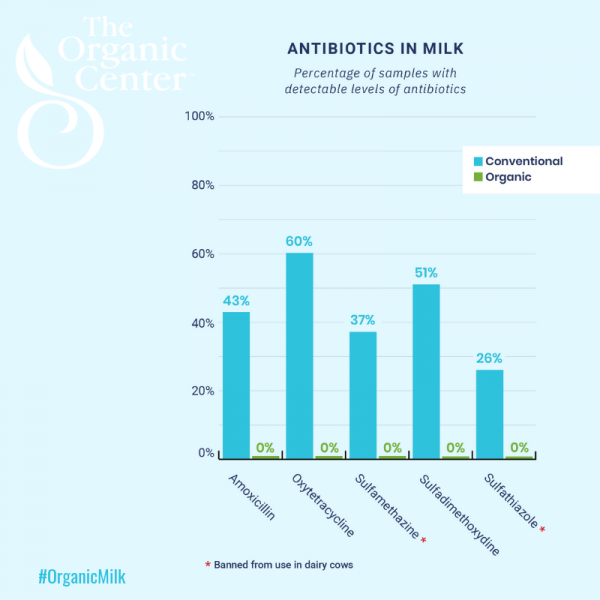 Milk is an important part of a healthy diet. It provides protein, fat, calcium and vitamin D, and for the youngest members of our population, it is especially critical as a main source of many nutrients. But not all milk is created equal. For nearly 15 years, studies have repeatedly shown that organic milk has a healthier nutritional profile. Organic milk contains more of the good omega 3 fatty acids, more antioxidants and a higher nutrient mineral content than conventional milk. Dairy cows under organic management eat more grass than those under conventional management and that difference in their diet results in more nutrient-rich milk. Now, a recent study conducted by scientists at Emory University in collaboration with The Organic Center found that organic milk is the cleanest choice for families. Researchers tested samples from milk purchased from the grocery store, to compare the differences in levels of antibiotics, growth hormones and pesticides in conventional and organic milk. The study found that a majority of samples of conventional milk tested POSITIVE for residues of antibiotics – two of which are banned from dairy production in the United States. The majority of conventional milk samples also tested POSITIVE for controversial pesticides. And, researchers found that residues of growth hormones in conventional milk were 20 times higher than in organic milk.