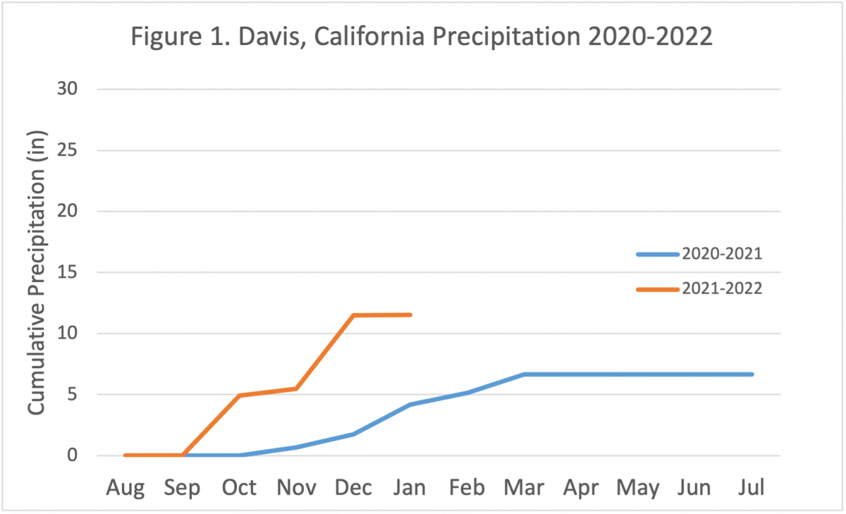It is rare to get the average rainfall in Davis, California and most years the rainfall is either much lower or higher than 20 inches. In 2020-2021, there was very little precipitation with approximately six inches for the entire winter. In the fallow season of 2021-2022, there was early rain in October- December, but no precipitation since early January. The cumulative total is about 12 inches thus far with no rain in the forecast, suggesting drought conditions will continue.