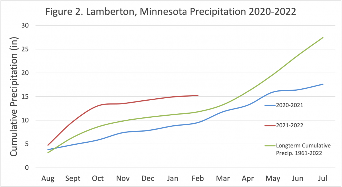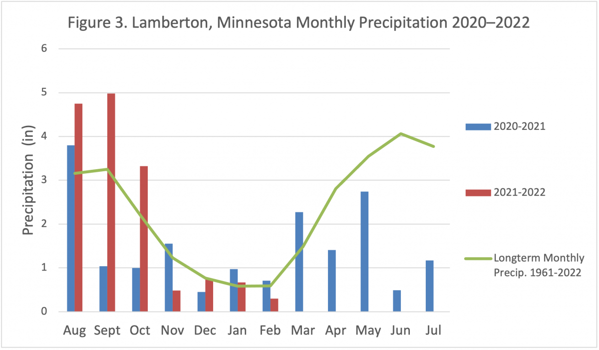 Minnesota precipitation varied over the first growing season of the trial. We had adequate rainfall during the establishment of the cover crop mixture in August 2020, however, during the summer of 2021 monthly precipitation levels remained consistently below the long-term historic value recorded at our National Weather Service (NWS) station. It was extremely dry during May, June and July of 2021 during the establishment of the spinach crop. Monthly precipitation amounts were above normal in August through October of 2021, during the establishment of the cover crop for the 2022 growing season, but have since dropped to at or below normal amounts