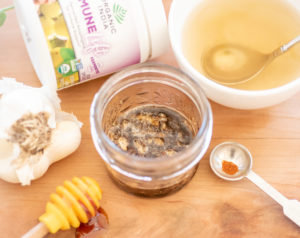 In a small jar, add 1 clove crushed garlic, 2 Tablespoons honey, and 1 Teaspoon ORGANIC INDIA Immune Lift, and stir together vigorously to combine.