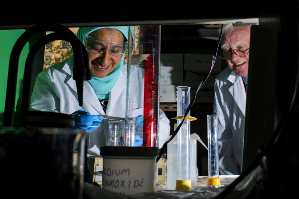 Elham Ghabbour, Principal Research Scientist Department Chemistry & Chemical Biology and Geoffrey Davies, Matthews Distinguished University Professor, work in Hurtig Hall at Northeastern University on Sept. 27, 2017. Photo by Matthew Modoono/Northeastern University