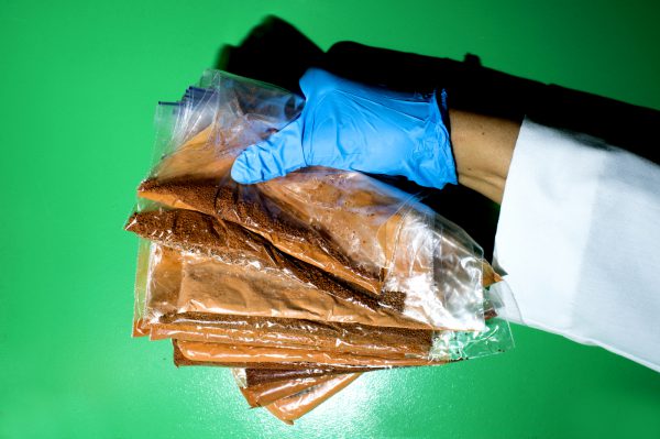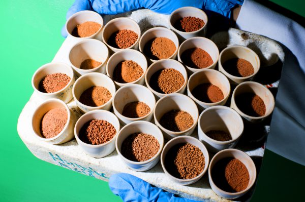 Dr. Ghabbour shows mineral residue from the combustion of soil at Northeastern University. Photo by Matthew Modoono/Northeastern University