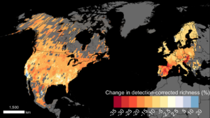 Map of climate related change in bumble bee populations from baseline period (1901-1974) to recent (2001-2014). Credit: Peter Soroye,