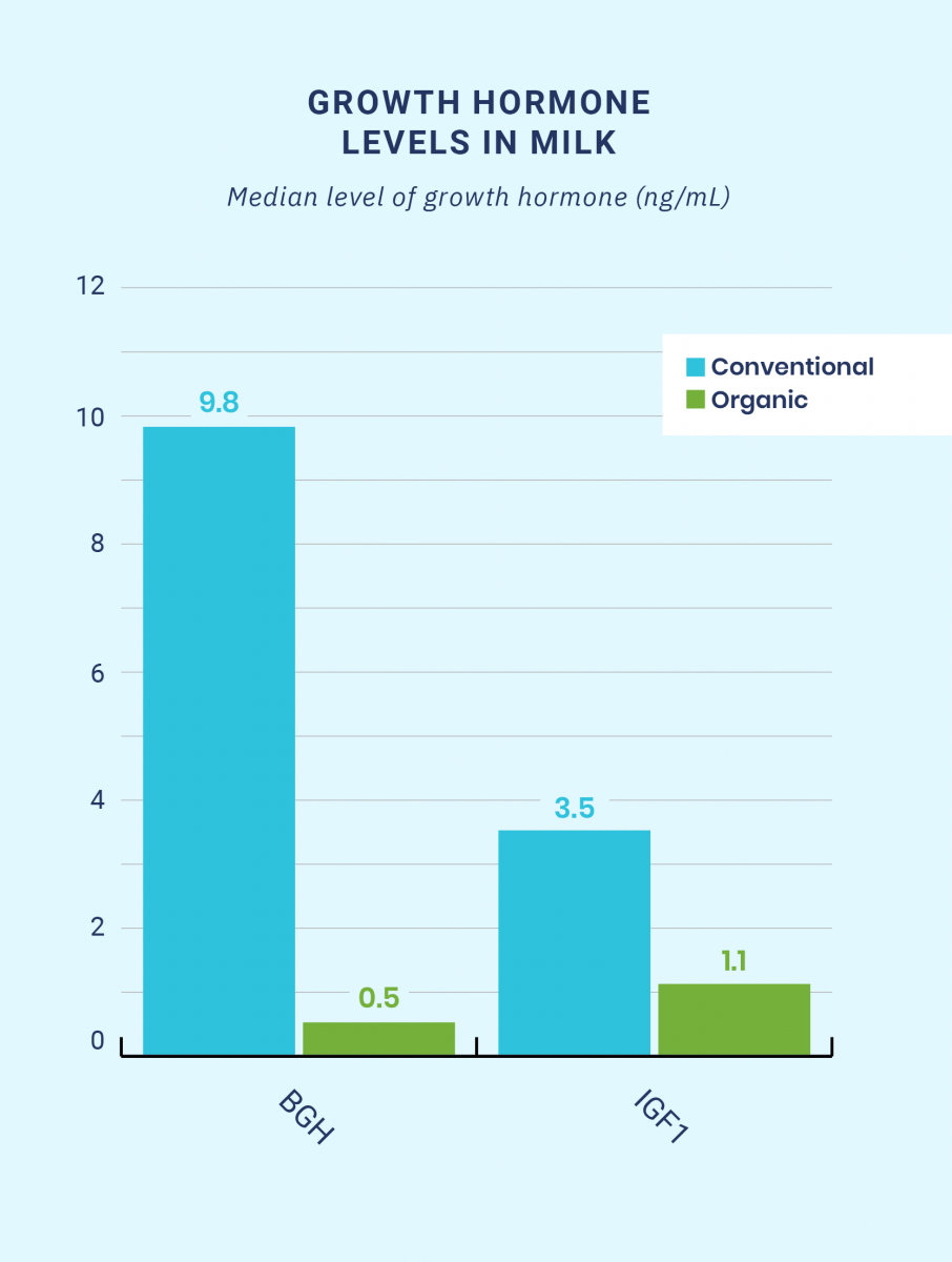 Bovine growth hormone (bGH) residue levels were found to be 20 times higher in conventional milk than organic.