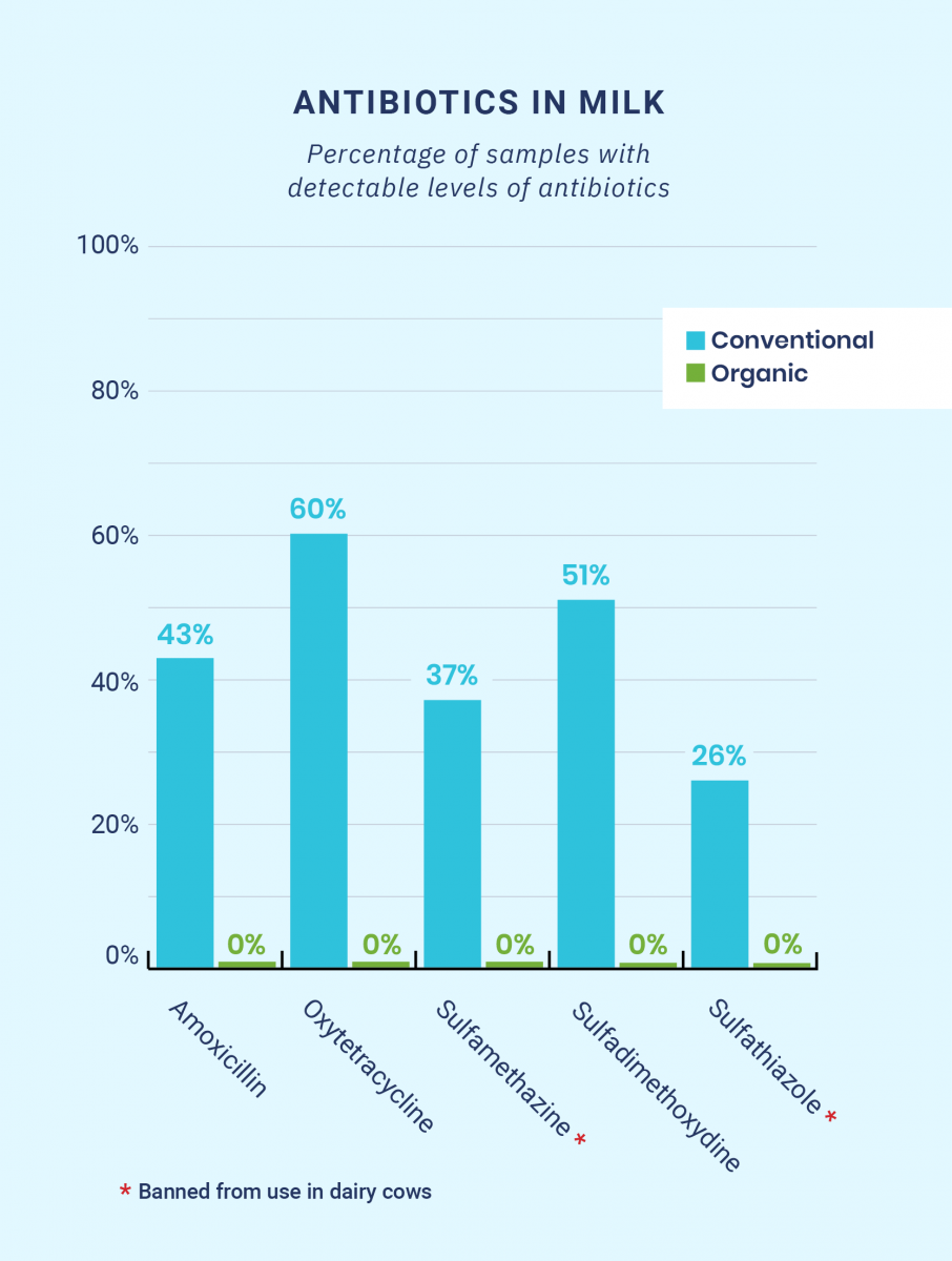 Because the overuse of antibiotics can increase resistance to those antibiotics and make them less effective for both humans and animals, the FDA has set limits on detectable levels of antibiotics in food. In this study, antibiotics were not found in organic samples, but were detected in 60% of conventional milk samples. Specifically, amoxicillin, oxytetracycline, sulfamethazine, sulfadimethoxine, and sulfathiazole were all detected in conventional milk.