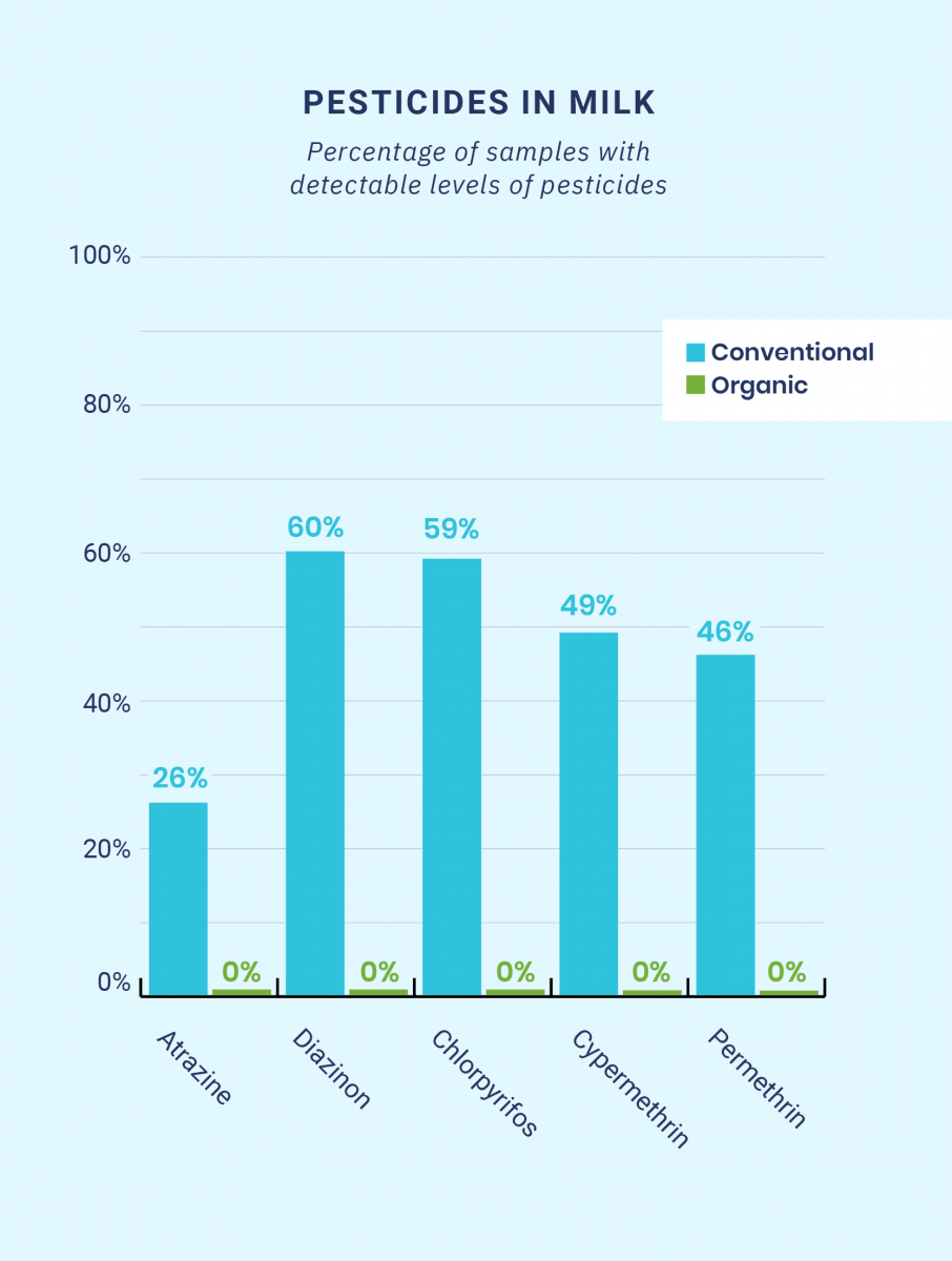 The results found no residues of commonly-used pesticides in any of the organic milk samples, but residues in up to 60 percent of the conventional samples.